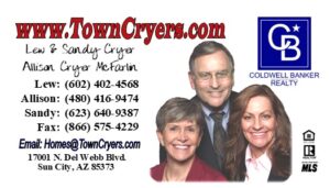 Lew, Sandy & Allison are full time Real Estate agents who reside in the Northwest Valley of Phoenix, Arizona, who specialize in the Retirement communities located in the Northwest Valley. We know and understand the unique needs of those retired or planning to retire. These retirement communities of Sun City, Sun City West, Sun City Grand, Sun Village, Corte Bella and Trilogy, Sun City Festival & Surprise plus others, offer amazing, creative opportunities for individuals and families 45+ and 55 or better! Email the Town Cryers for information. We can provide maps and/or available properties in Sun City, Sun City West, Sun City Grand, Sun City Festival, Corte Bella, Sun Village, Trilogy, Surprise and other Northwest Valley communities.
